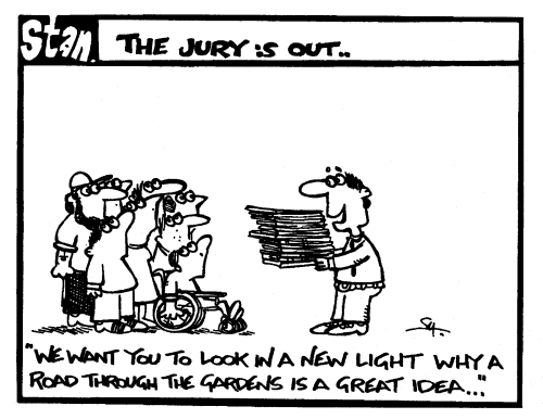To overcome the issue of putting a road through the middle of the Ada Ryan Gardens, one suggestion was to have a JURY decide the issue. Needless to say it never happened and the road idea was abandoned.